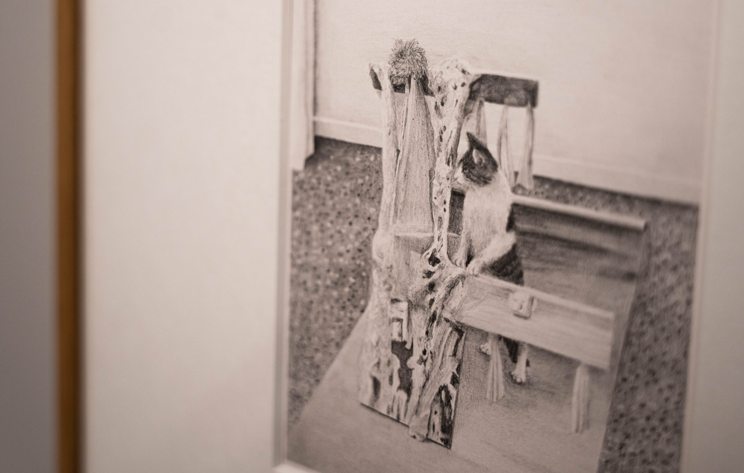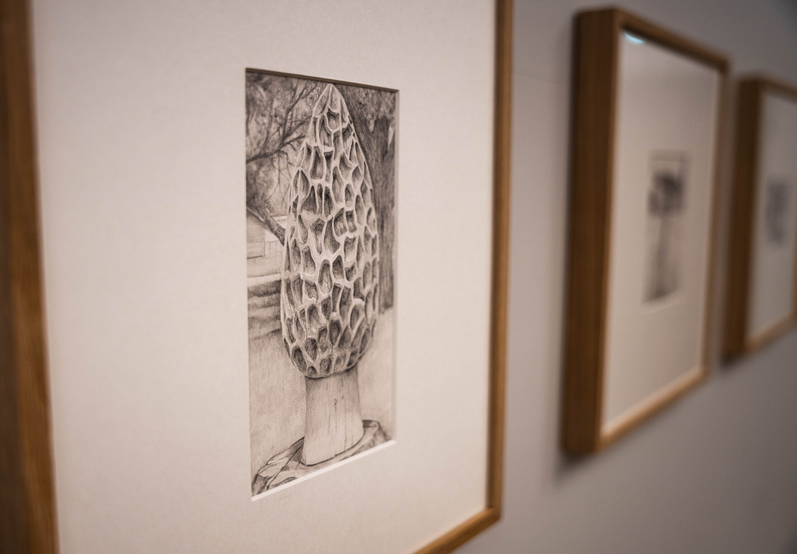 L’exposition dévoile également une facette plus graphique de l’artiste. Dans la dernière salle, le visiteur découvre des dessins d’une grande finesse : champignons et chats (les siens), réalisés avec une précision remarquable.