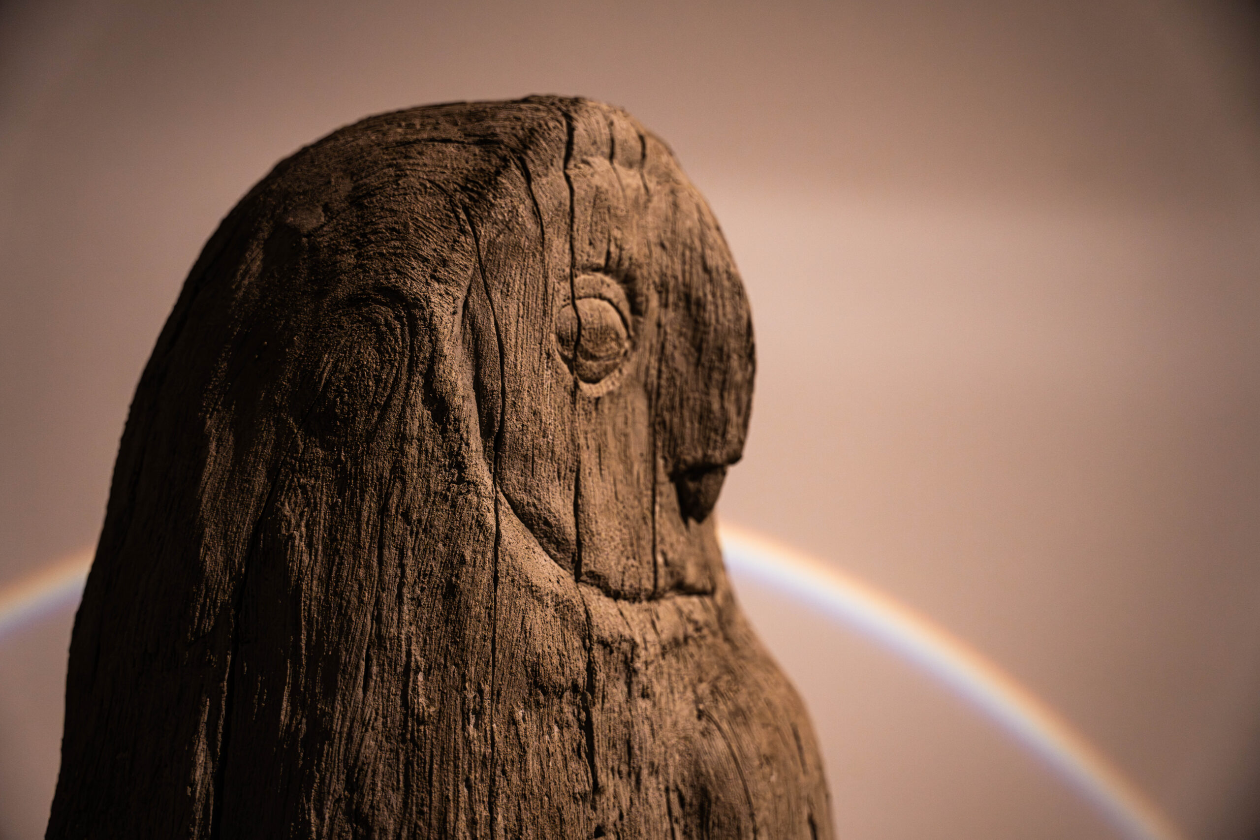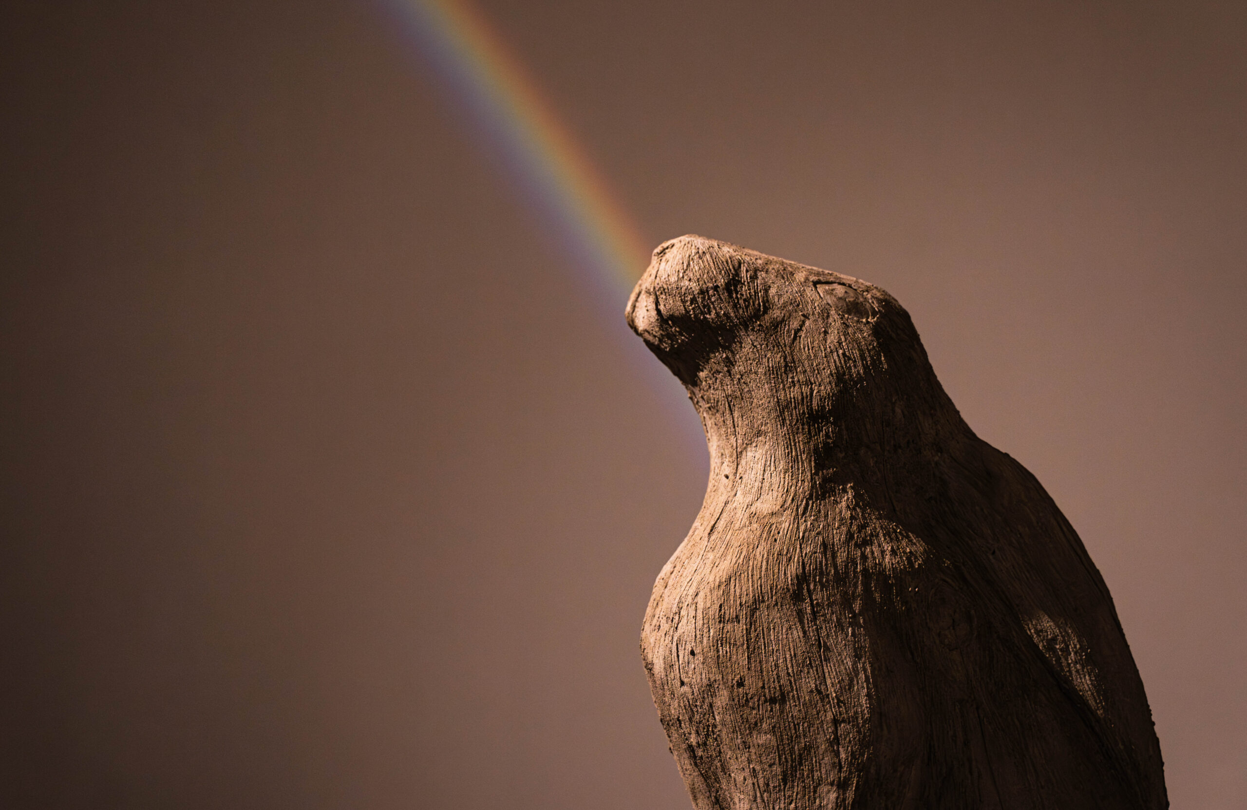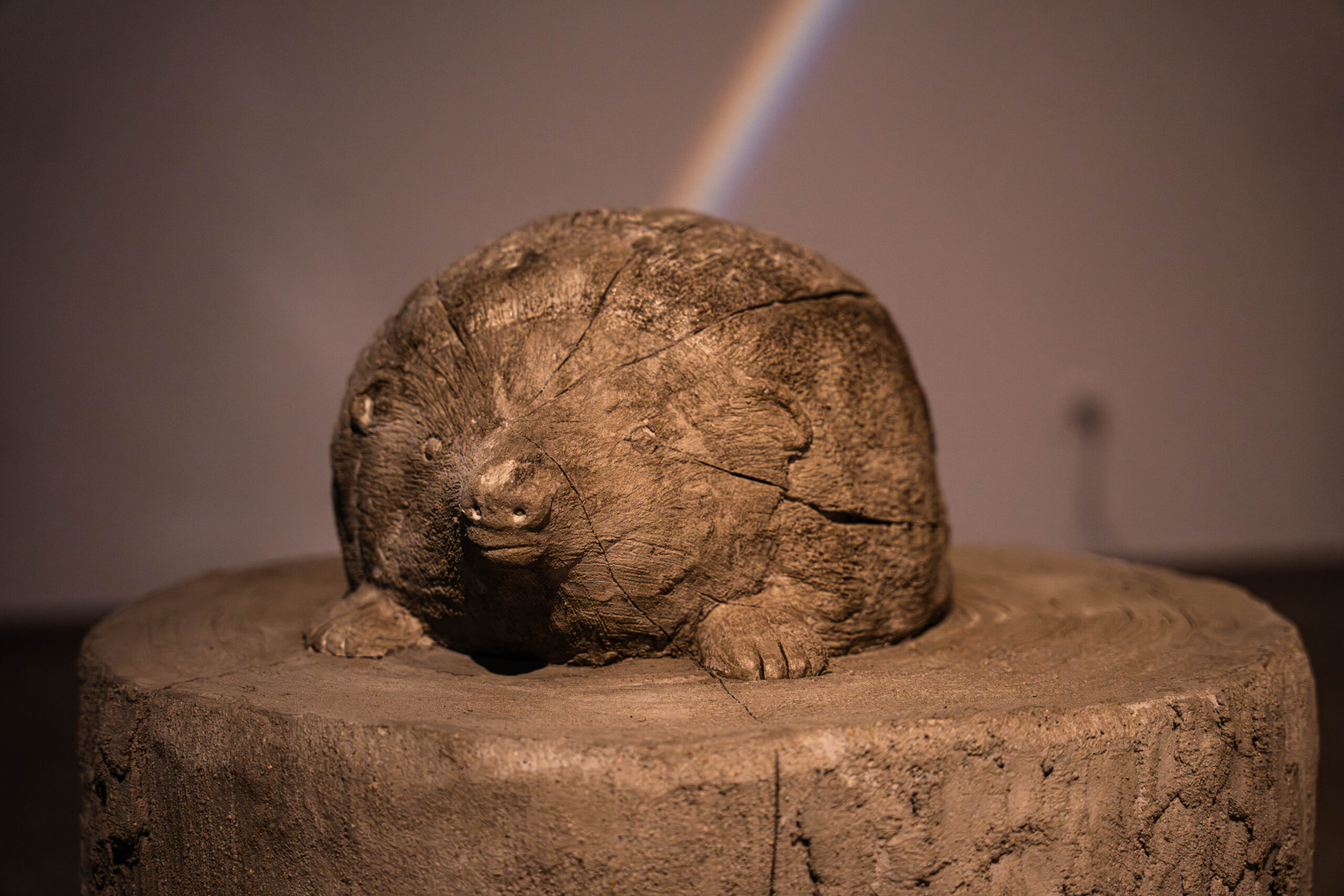 Dans la salle dite « des Sœurs », une installation hors du commun plonge le public dans une atmosphère onirique. La pièce, volontairement assombrie, révèle trois animaux présentés dans leur totalité, posés sur des troncs d’arbres. Un dispositif lumineux projette des arcs-en-ciel sur les murs, transformant l’espace en un décor presque festif et résolument poétique.