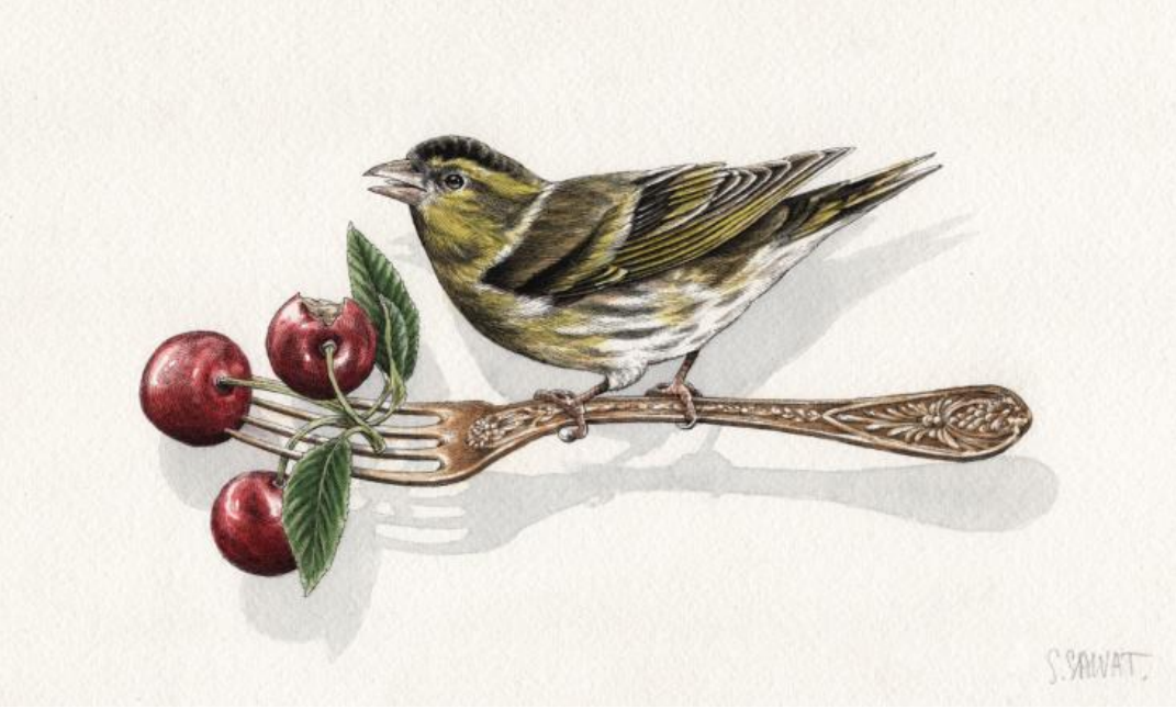 Cette œuvre présente une vision de « rapine estivale » par un oiseau délicatement perché sur une fourchette ornementée : un instant éphémère capturé par le geste artistique …