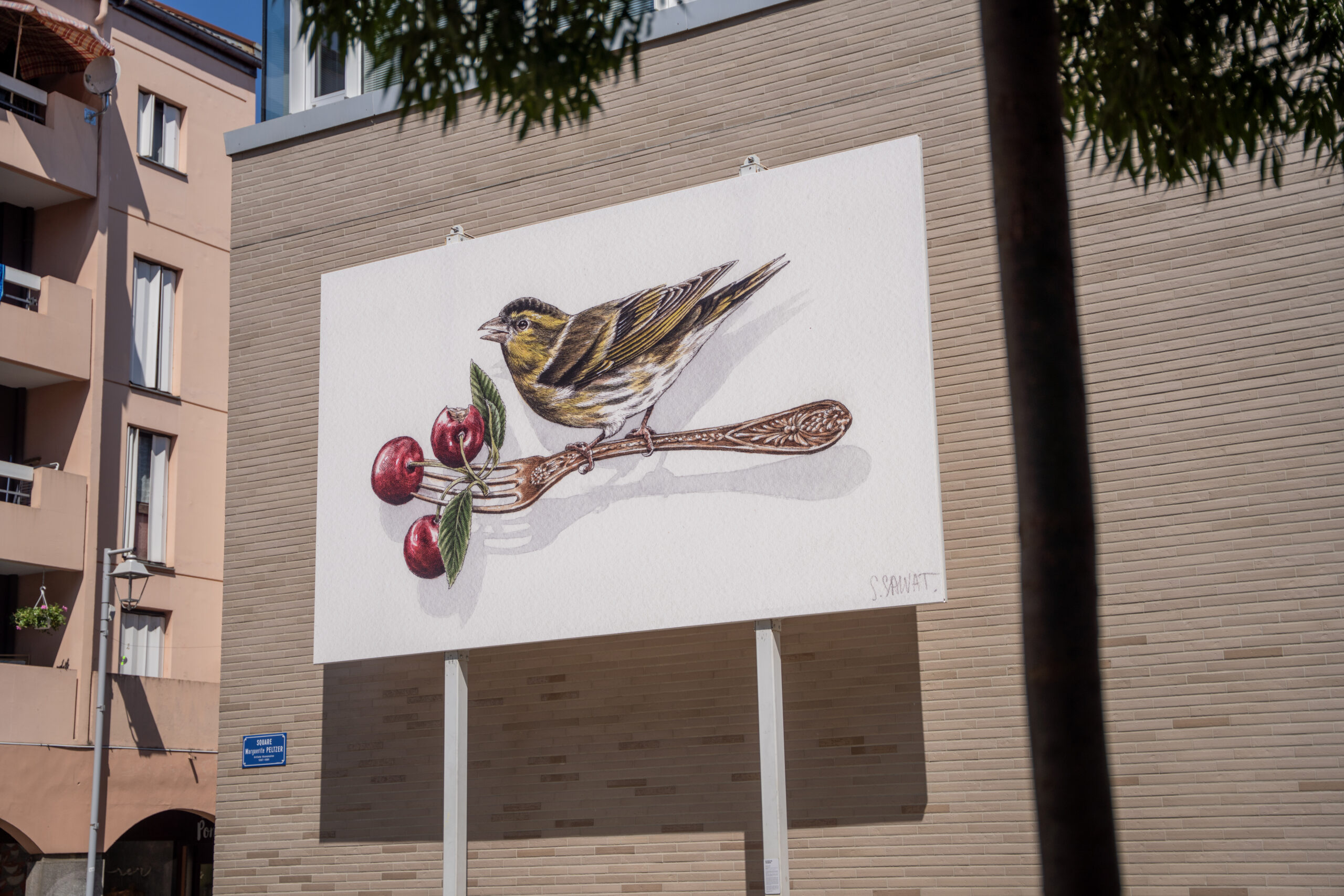 À l’occasion du 3e volet 2025 du Mur de Thonon, une œuvre de l’artiste parisien Steeven Salvat s’expose en grand format au cœur du centre-ville. Intitulée « Festin estival 1 », cette aquarelle à l’encre de Chine met en scène un oiseau délicat perché sur une fourchette ornementée. Une vision poétique de la nature à découvrir en plein air, dans le cadre du Festival L’Art dans la Rue.
