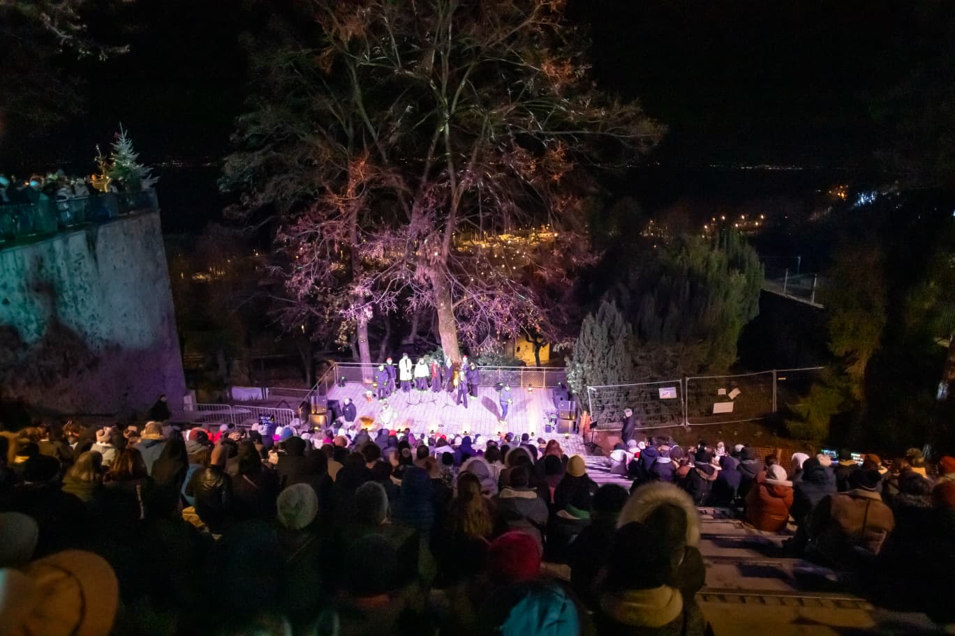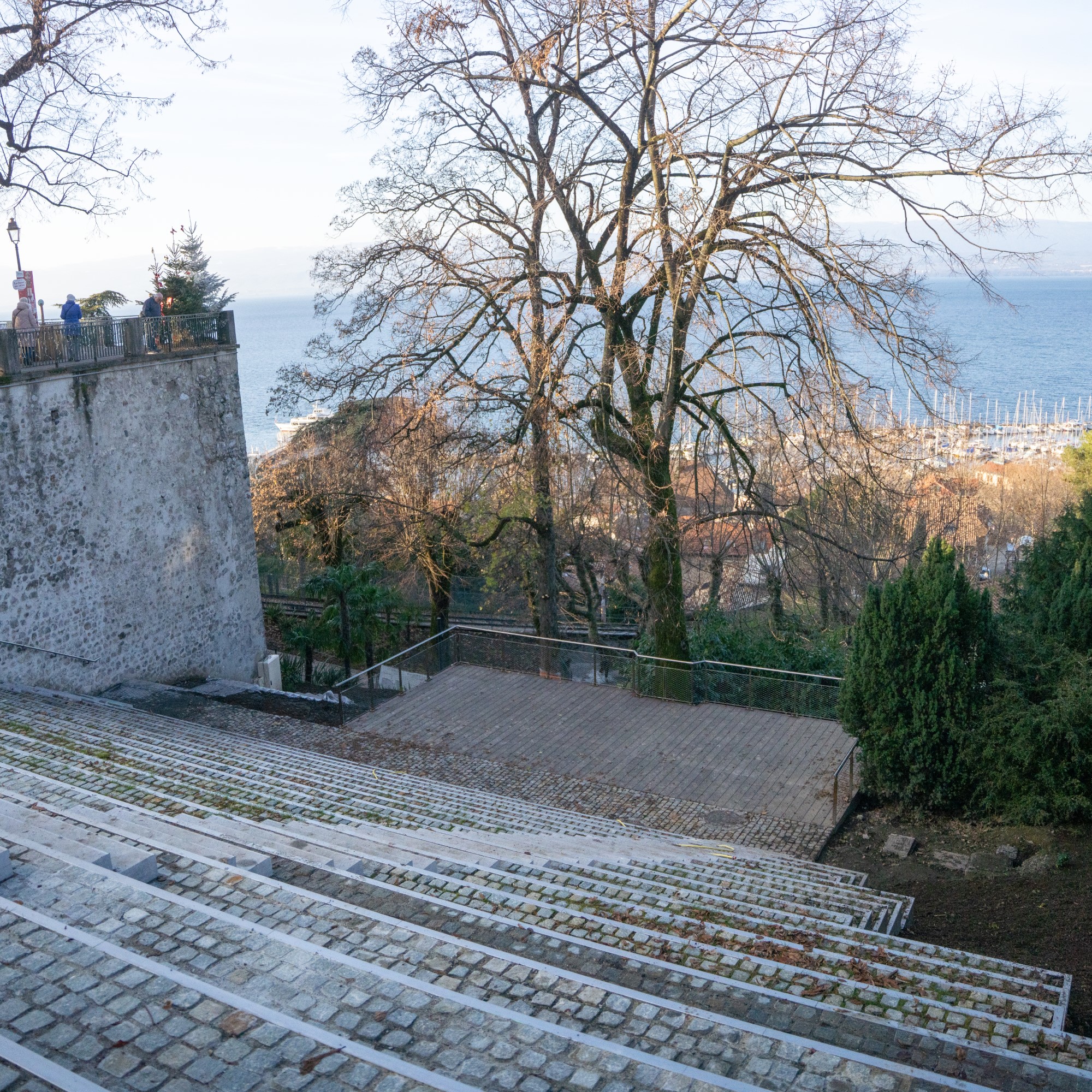 Situé en haut du parc Léman, immédiatement en contrebas du belvédère très fréquenté par les promeneurs, le théâtre de verdure a été révélé au public lors des Féeriques 2025. Il constitue désormais un nouvel écrin événementiel pour Thonon, enchâssé dans les deux hectares du parc en cours d’aménagement.