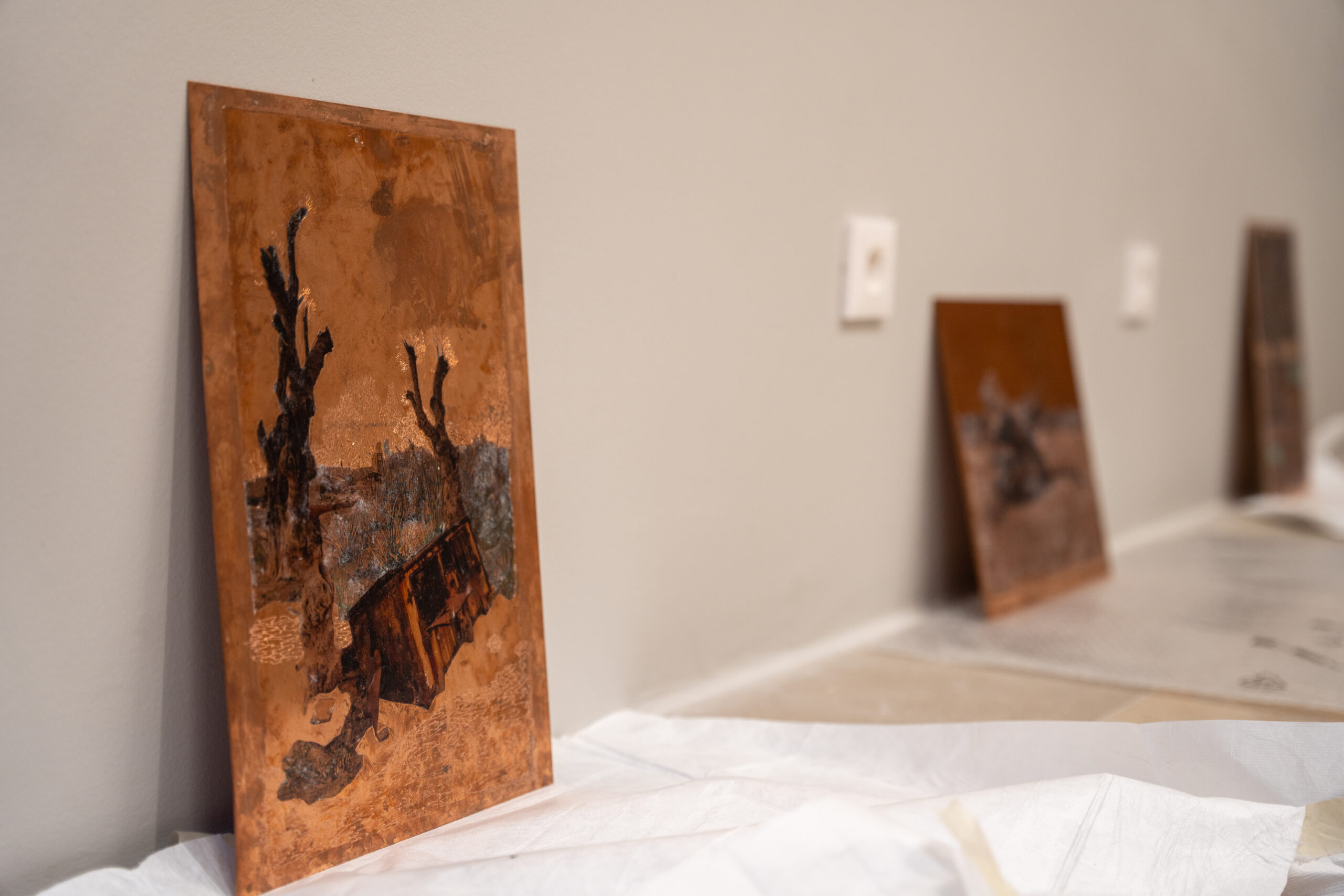 Dans cette exposition, vous découvrirez aussi des photographies gravées sur des plaques de cuivre, souvenirs d’une exploration en Amérique du Sud où les mines de cuivre modifient le cours des fleuves, ainsi que des céramiques taillées à froid. Là encore, les copeaux et découpes évoquent ce même geste du relief, donnant vie et mouvement à la matière.