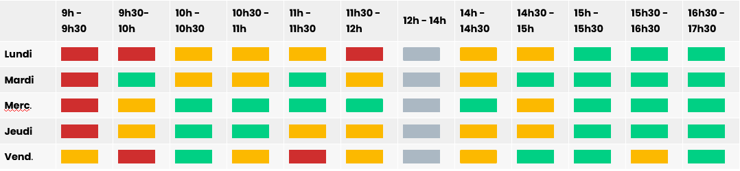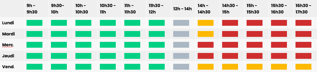 Découvrez ci-dessous le taux moyen de fréquentation au service Atout seniors. Choisissez, si vous le pouvez, un créneau à faible affluence afin de limiter votre attente :